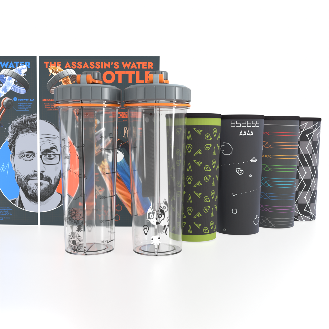 The official assassin's water bottle with poison measurements AND Schrodinger's cat bottle